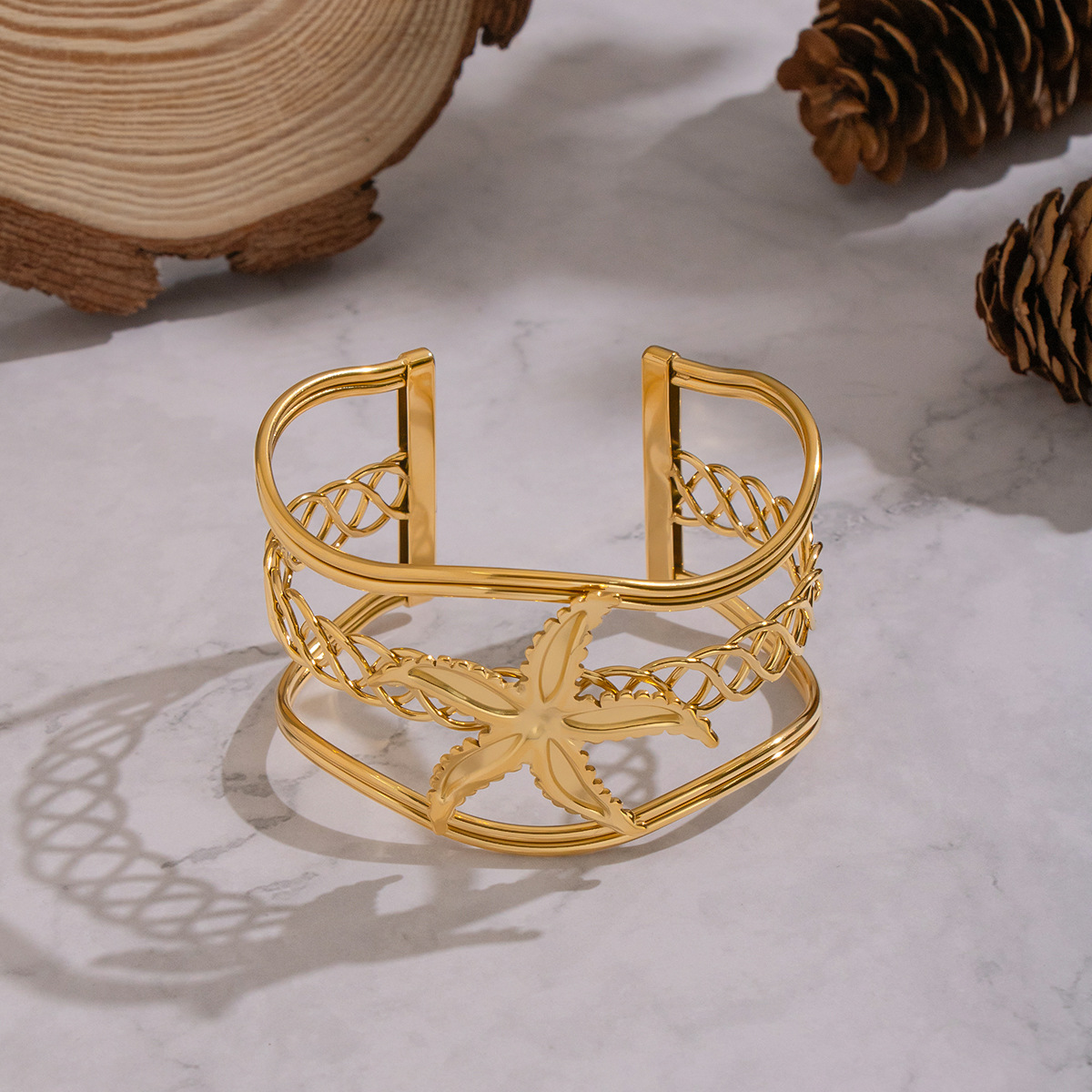 It is usually made of stainless steel plated with real gold, featuring excellent color retention and resistance to oxidation and fading. It requires no frequent care during daily wear. The glossy metal process makes the starfish and woven textures present a delicate luster under the light, and the visual texture is close to that of light luxury jewelry